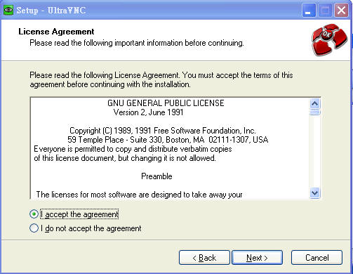 步驟 2. 選擇 “I accept the agreement”, 按 “Next" |